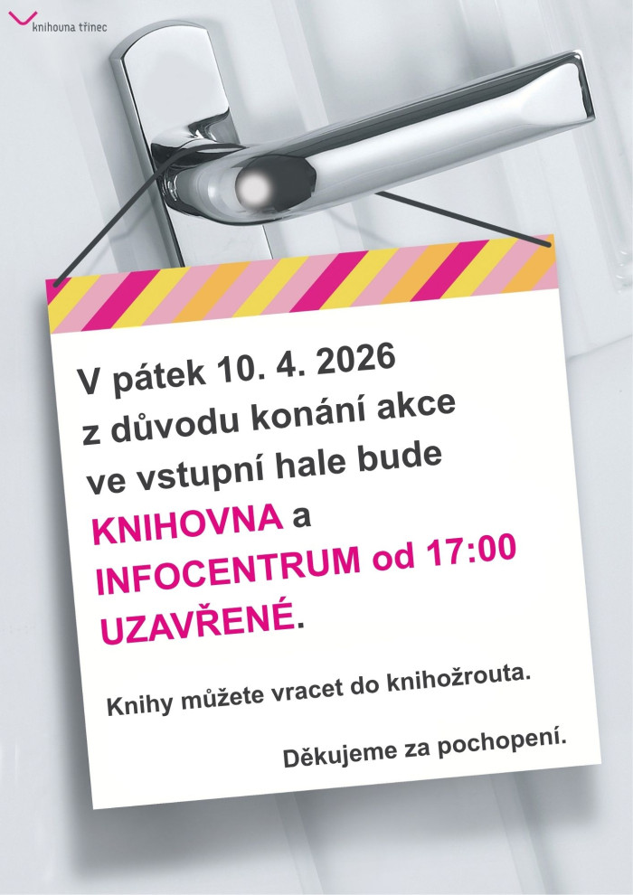 Z důvodu konání akce jsme v pátek 10. 4. 2026 nuceni zkrátit otevírací dobu knihoven a Infocentra do 17:00.
