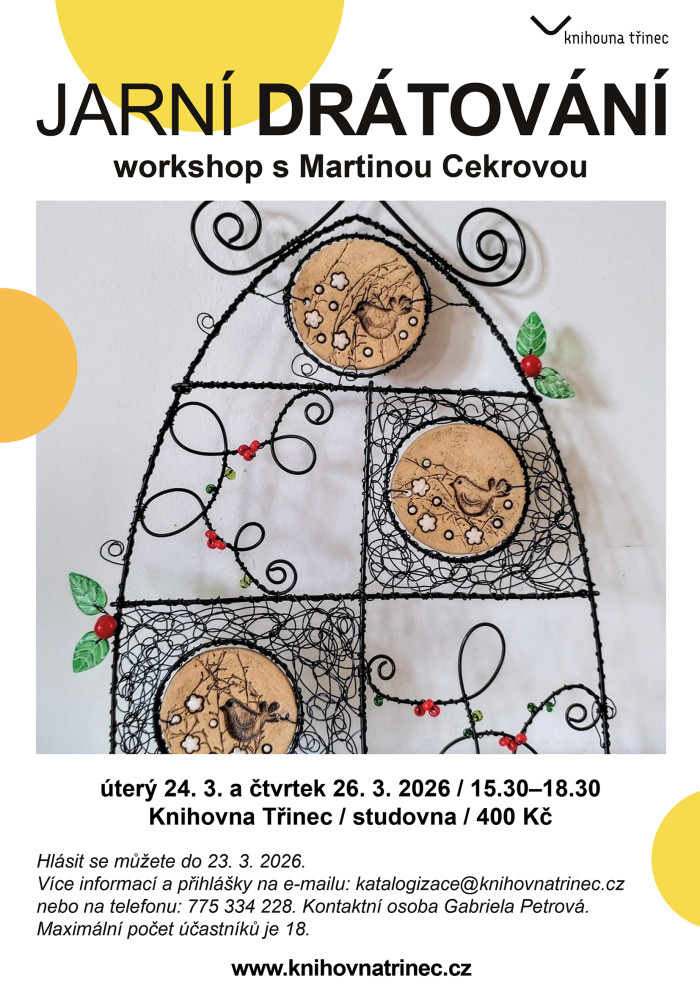 Ve čtvrtek 26. března 2026 v 15.30 si můžete přijít odpočinout a během workshopu Jarní drátování si vyrobit drátěnou dekoraci, která jistě ozdobí váš domov. Tvořivou dílnu opět vede zkušená a oblíbená lektorka Martina Cekrová.